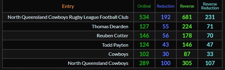 - Record: 72 | 6 | 0 | 0 | 24 (Pld-T-G-FG-Points)